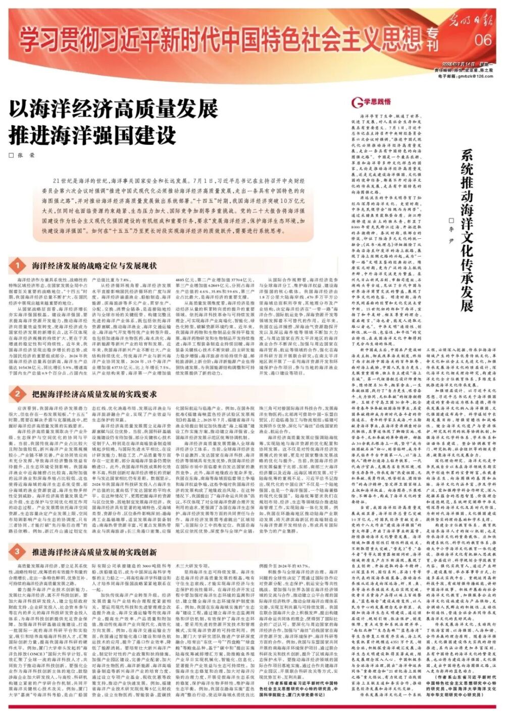 21世纪是海洋的世纪,海洋事关国家安全和长远发展。7月1日,习近平总书记在主持召开中央财经委员会第六次会议时强调“推进中国式现代化必须推动海洋经济高质量发展,走出一条具有中国特色的向海图强之路”,并对推动海洋经济高质量发展做出系统部署。“十四五”时期,我国海洋经济突破10万亿元大关,但同时也面临资源约束趋紧、生态压力加大、国际竞争加剧等多重挑战。党的二十大报告将海洋强国建设作为社会主义现代化强国建设的有机组成和重要任务,要求“发展海洋经济,保护海洋生态环境,加快建设海洋强国”。如何在“十五五”乃至更长时段实现海洋经济的质效跃升,需要进行系统思考。