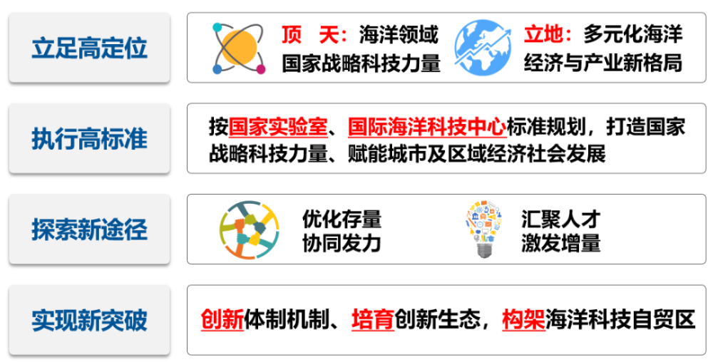 实验室着重布局海洋科学前沿基础研究(未来枢纽),海洋智能观探测技术与装备研发(智慧枢纽),海洋资源开发与绿色制造及应用(蓝色枢纽),海洋可持续发展新理论、新模型、新数据、新技术(永续枢纽)四大研究方向,打造高层次高水平人才汇聚的公共支撑平台体系,为构建海洋科技创新生态系统创造全方位的条件保障。