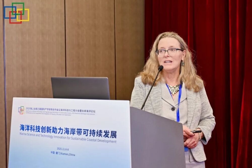 主旨演讲环节由自然资源部第二海洋研究所名誉所长苏纪兰院士主持,来自国内外的资深专家做了精彩报告。中国海洋发展基金会副理事长兼秘书长潘新春教授以详实数据系统阐述了中国海洋产业的升级路径与发展成就,揭示了海洋强国战略的深刻内涵;国际鲍鱼协会主席、美国加州大学戴维斯分校Laura Rogers-Bennett教授深入剖析了气候变化对水产养殖的挑战,并分享了从遗传育种创新到生态系统修复等多维度的适应性技术策略;中国海洋大学副校长王厚杰教授从高校视角出发,阐释了其以科技创新支撑海洋经济高质量发展的学科布局与产学研用协同体系;哈尔滨工程大学水声工程学院院长乔钢教授则重点介绍了其团队在水声通信、组网及跨介质传输等关键技术上的突破,展现了水下信息技术赋能智慧海洋建设的广阔前景。