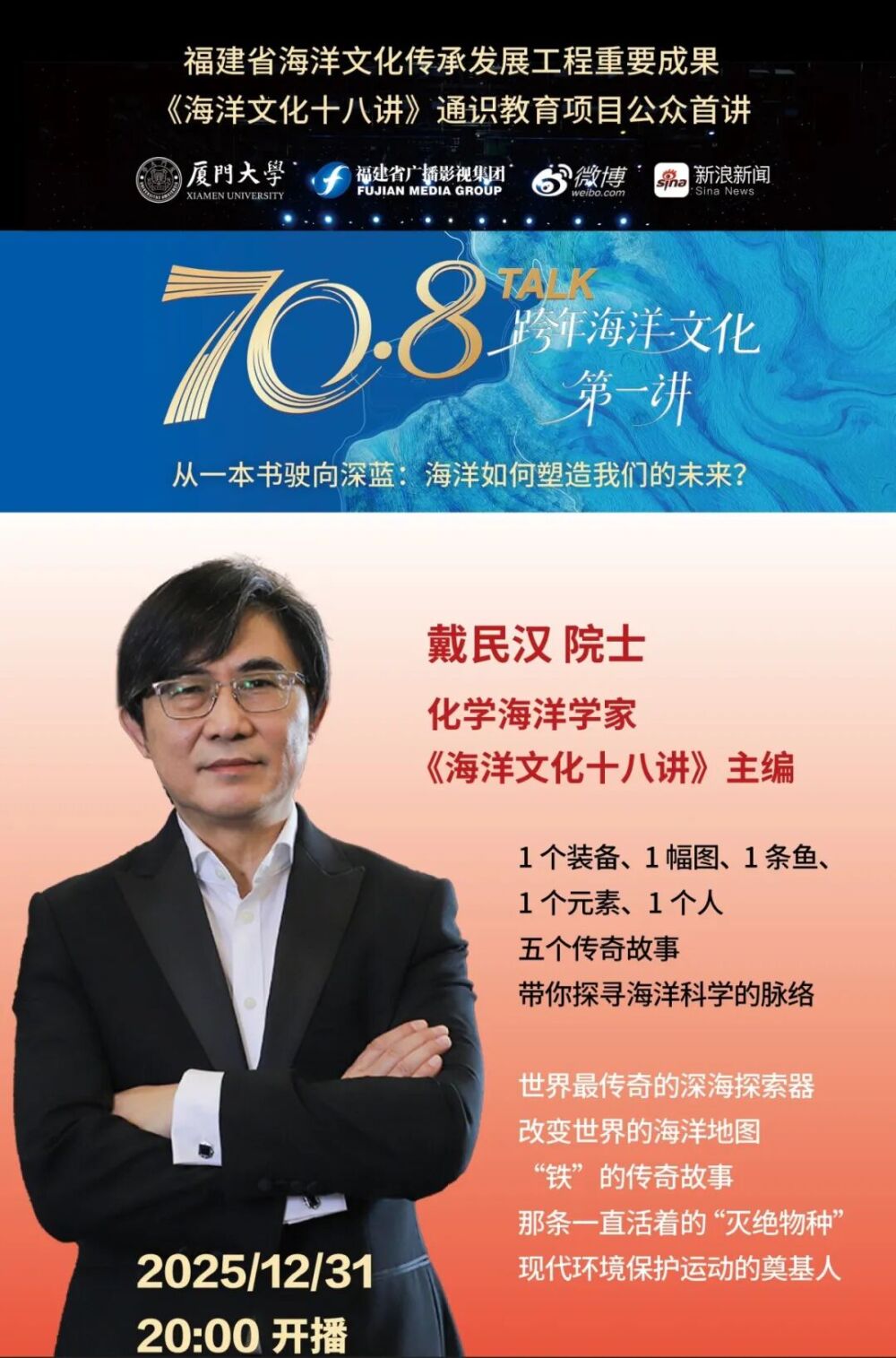 「70.8 TALK:跨年海洋文化第一讲」首讲重磅开启,戴民汉院士亲临。不谈公式与论文,只讲述五个传奇故事:深海重器有多强?一张图何以改变世界航运?四亿年前“灭绝”的鱼如何重现深海?什么元素对海洋生态至关重要却被忽略?是谁以一本书推动全球环保?