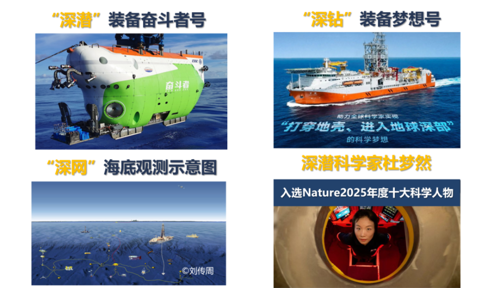 阿尔文号还有一个重要角色,就是促进了包括中国在内的全球深海研究领域技术装备的研发,且从未停滞。人类目前依然在探索极端的环境、地球深部过程、生命起源以及新型资源这类与人类生存生存和自然认知密切相关的科学难题。我非常高兴地和大家分享中国的“三深”技术,分别是深潜、深钻、深网。