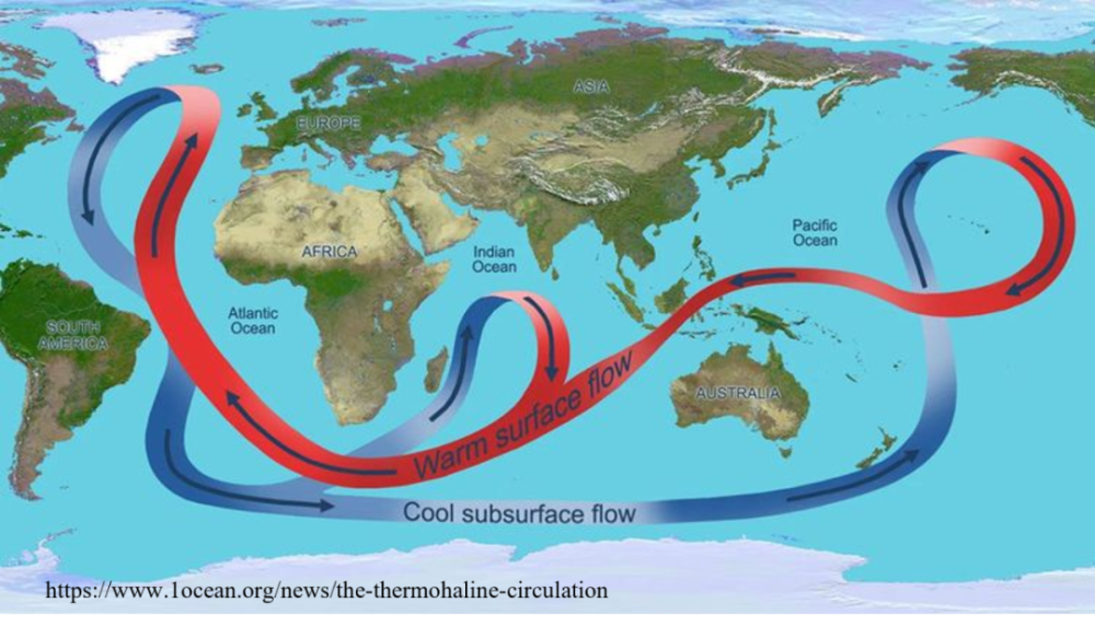 由密度差异驱动的热盐环流,几乎连接着全球各个大洋。在北大西洋的格陵兰岛东边就有一个全球垂向环流的起始点,海水显著地自上而下运动,生成大西洋深层水。只有这里的水不断下沉,才能保障热盐环流不断运行。就如电影《后天》中展示的,当因为冰盖融化淡水注入,海水密度变低而无法下沉时,北大西洋的暖流(经向翻转流)停滞,阻碍了整个大洋的热盐环流,调节气候的作用也就被阻断了。