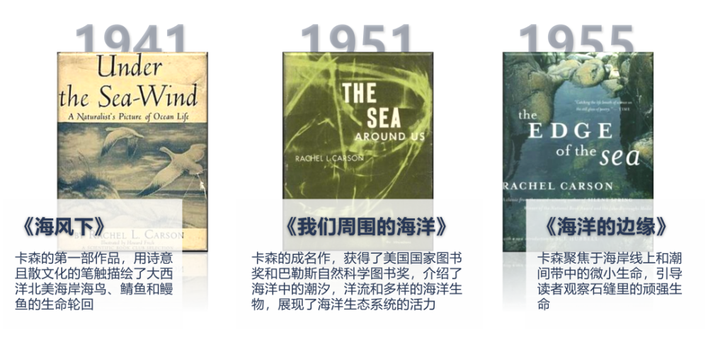 海洋生物学家卡森是为公众而写作的科学家,她的理念就是“如果公众能够理解科学,社会就能做出更好的选择”。出生于宾州的一个农民家庭的卡森拥有把科学讲给普通人听的天赋,在那本最著名的《寂静的春天》之前,她发布了海洋三部曲,分别是《海风下》《我们周围的海洋》《海洋的边缘》,她告诉大家自然不是资源仓库,而是一个精密、相互连接的生命系统,人类只是其中的一部分。