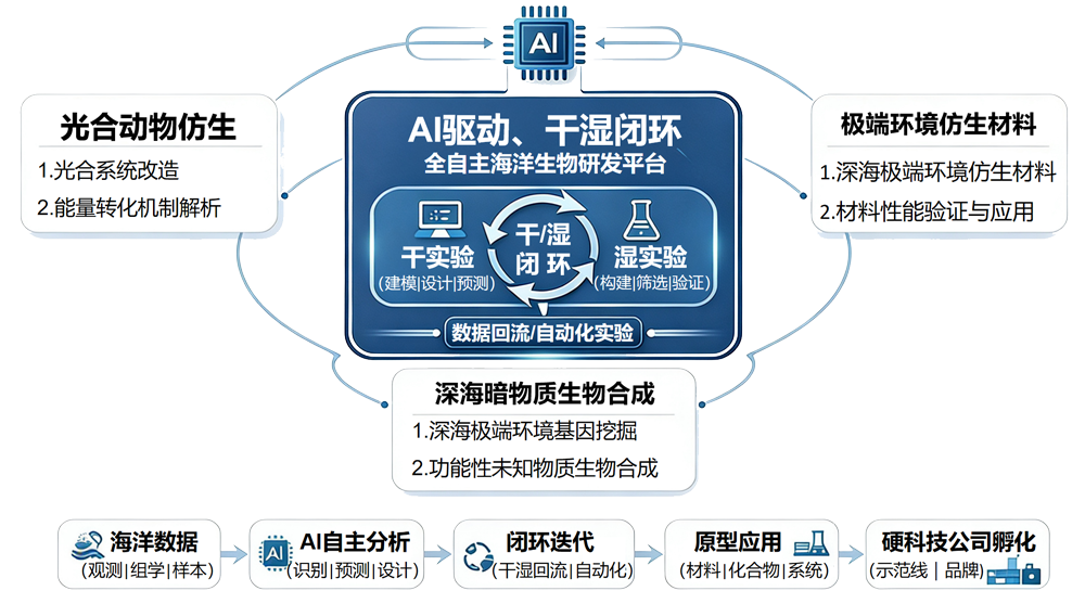 中心发起海洋生物研发“范式革命”,构建“AI驱动、干湿闭环”的智能研发系统,聚焦光合动物仿生、极端环境材料、深海暗物质生物合成三大生物智造前沿方向。旨在提升研发效率1-2个数量级,抢占蓝色生物经济制高点,孵化硬科技企业。
