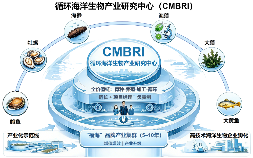 循环海洋生物产业研究中心(CMBRI)是鹭江实验室实现技术产业转化的核心支柱,专注解决海洋产业“增产不增值”的瓶颈。平台以海参、海藻、大藻、鲍鱼、牡蛎、大黄鱼等福建六大优势资源为核心,重构“育种—养殖—加工—循环”全价值链,推行“链长+项目经理负责制”。目标在5-10年内打造“福海”品牌产业集群,通过产业化示范线实现增值增效,并孵化高技术海洋生物企业。