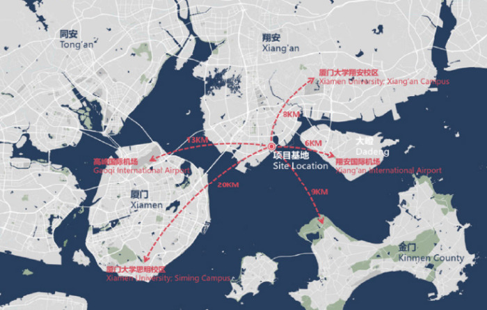 实验室选址位于翔安欧厝片区厦门海洋高新技术产业园区内东边地块,交通便利,距最近地铁站1.2公里:离翔安机场约为7公里,10分钟内可达;离翔安机场高速互通口约9公里,可快速连接厦蓉高速、沈海高速等。同时,选址毗邻地块临近核心科研单位,有助于促进资源有效整合、人才联合培养,共同辐射带动周边海洋产业发展。